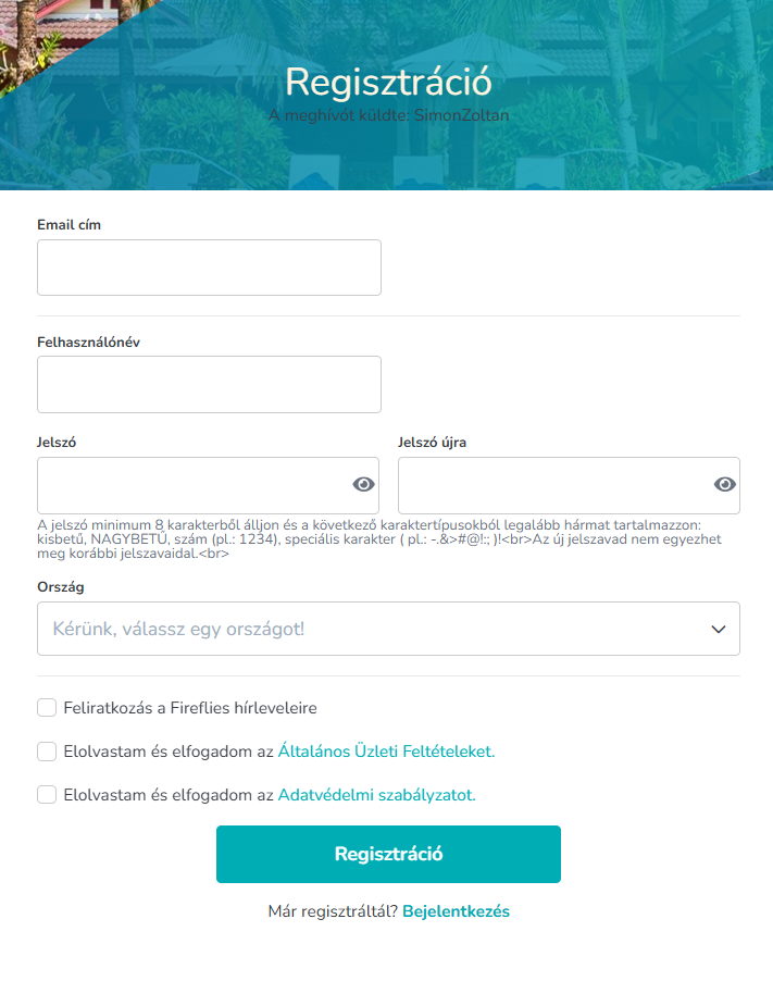 Kérjük használja a regisztrációs ívet, és regisztrálja be magát  a Fireflies.com oldalra . Ezt a regisztrációt bárki, akár egyénileg is végezheti.